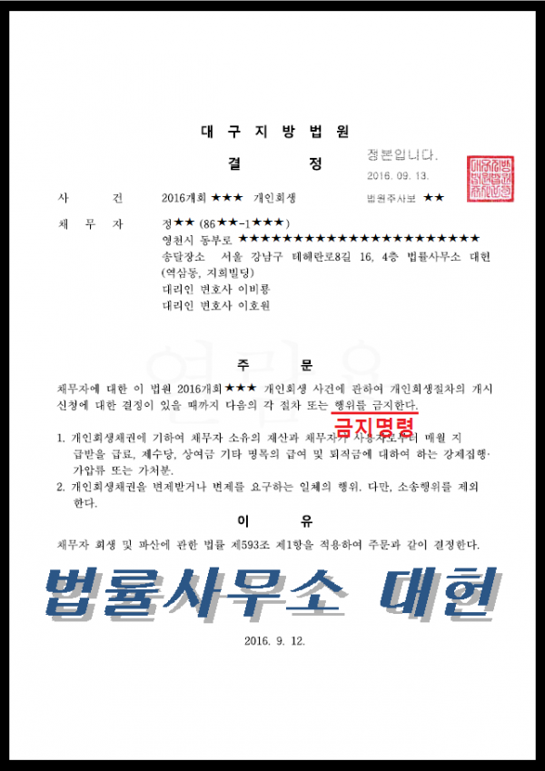 금지결정 | 대구지방법원 페이지 정보 작성자 법률사무소 디에이 작성일17-06-27 15:16 조회3,184회 댓글0건 이전글 목록 본문 지역 : 영천시 망정동 신청인 : 30대 직장인 남 소득 : 130만원 1인생계