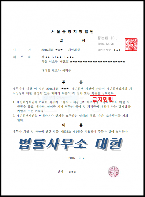 금지결정 | 서울지방법원 페이지 정보 작성자 법률사무소 디에이 작성일16-12-24 18:01 조회2,849회 댓글0건 이전글 다음글 목록 본문 금지명령이란? 채권자의 추심행위를 금지시키기 위한 법적인 조치입니다.